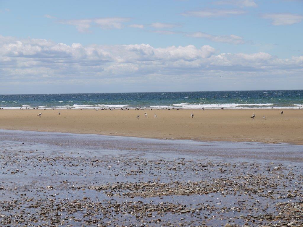 I love it here, Cape Cod. The sea is so deep blue set against the pale blue sky. There is a cool north wind to balance the sun’s fierce rays. And, after an all-day 12 mile walk along the north shore, I can report that there is no-one here. I am alone with only the right whales spouting, breaching and tail flipping to offer company. It is such a privileged sight.