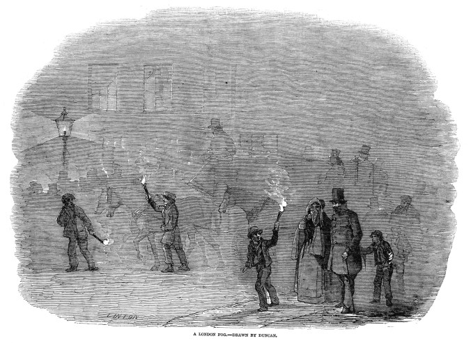 LONDON: STREET SCENE, 1847. Pedestrians use torches to aid their journey through the foggy streets of London, England. Wood engraving from an English newspaper of 1847. Granger Historical Picture Archive / Alamy Stock Photo.