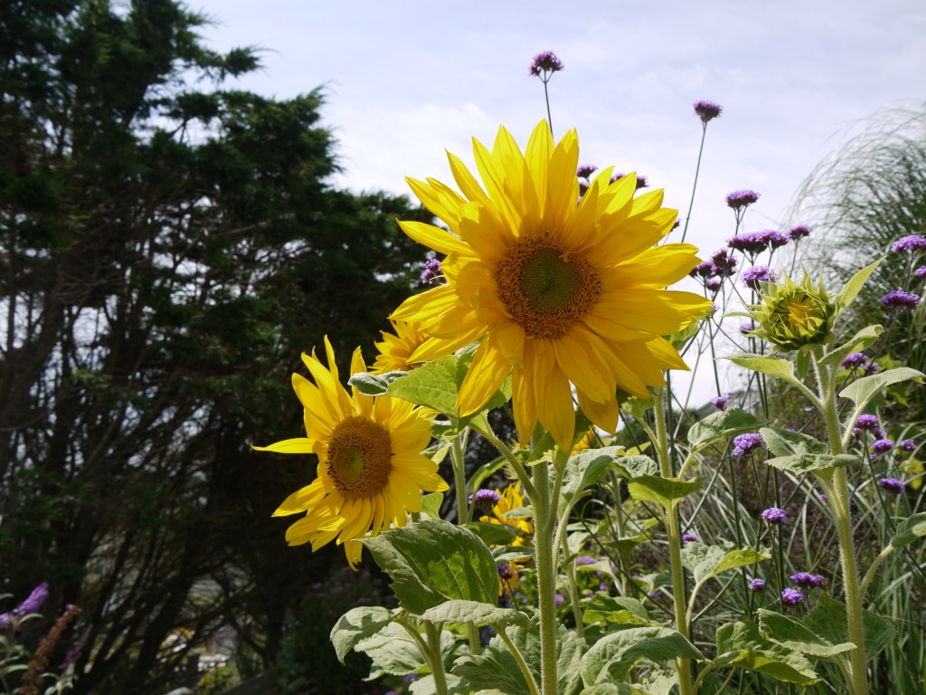 All that heat, and the occasional summer downpour, created a great burst of growth in our seaside garden. The agapanthuses and sunflowers have burst into life, and the border plants compete for your attention.