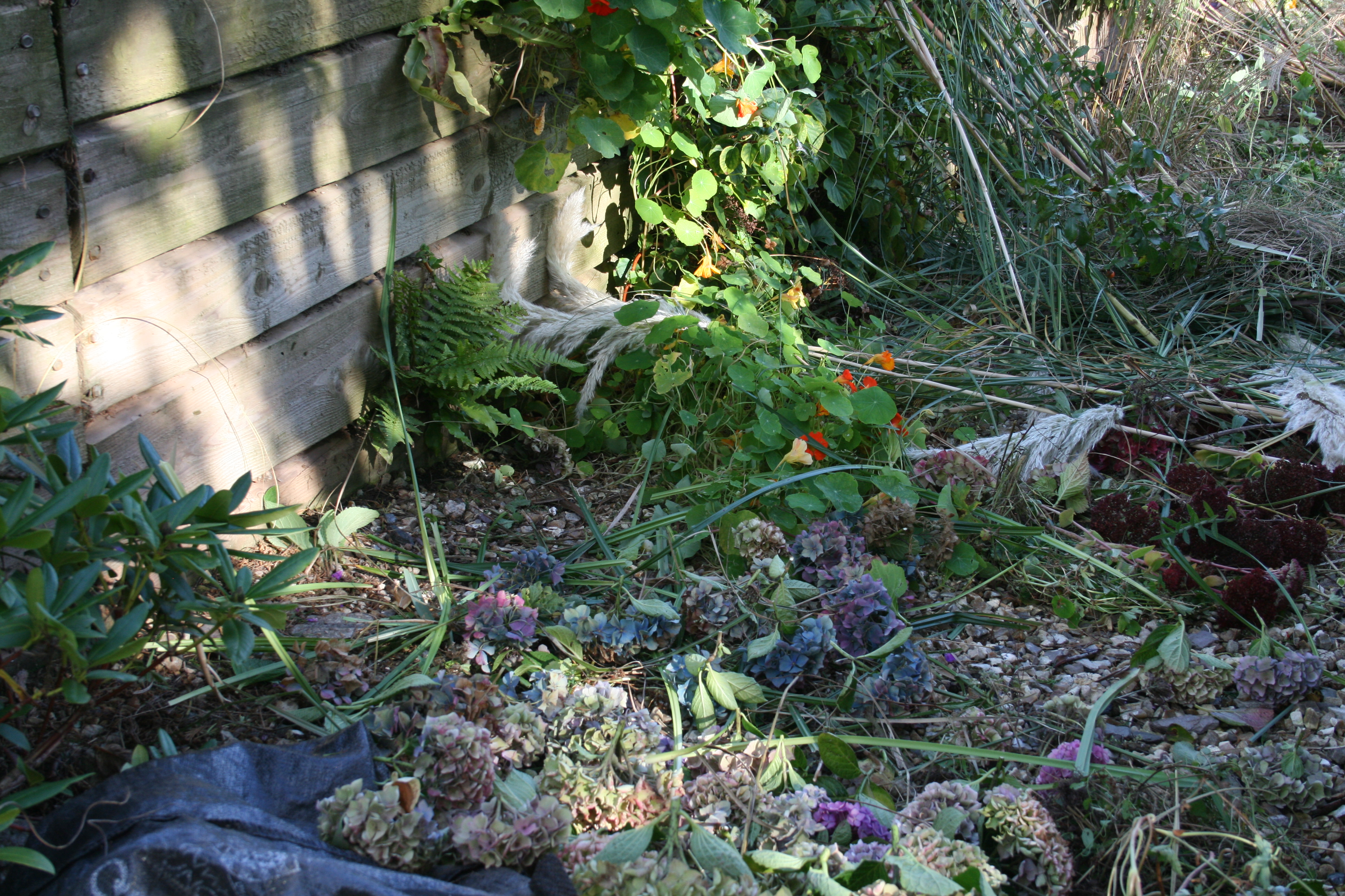 On a few lucky days, the sky is clear and the sun, although weaker, shines into the secret garden where the sheltered plants are still hanging on.