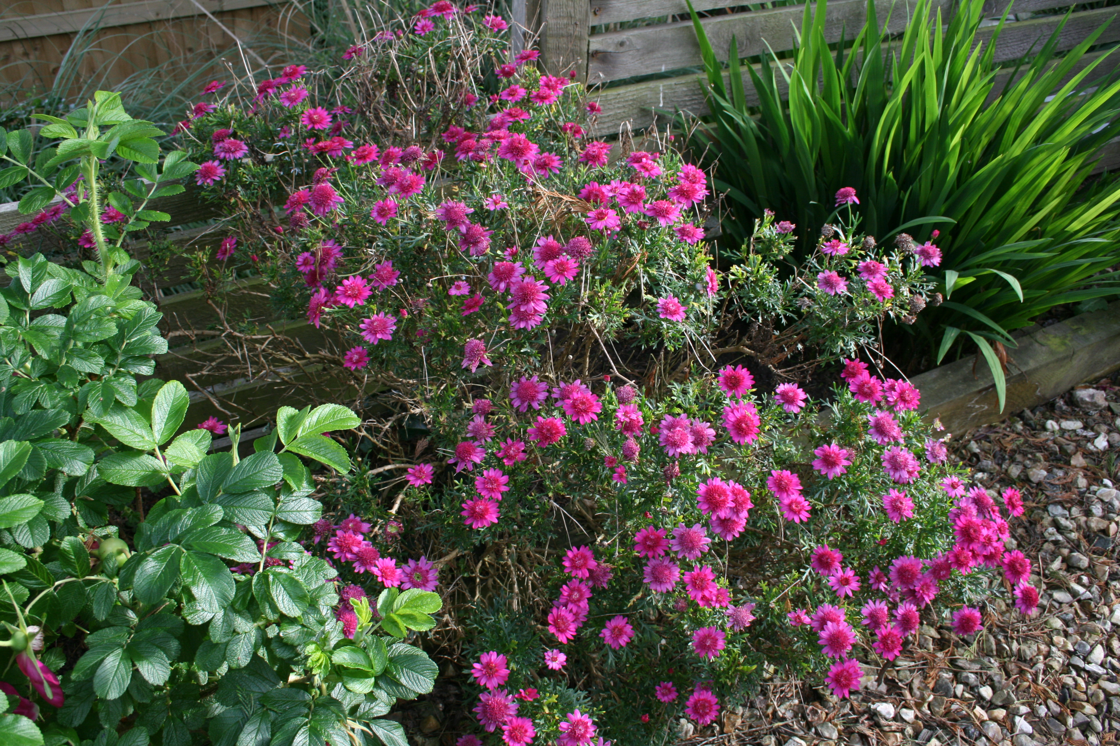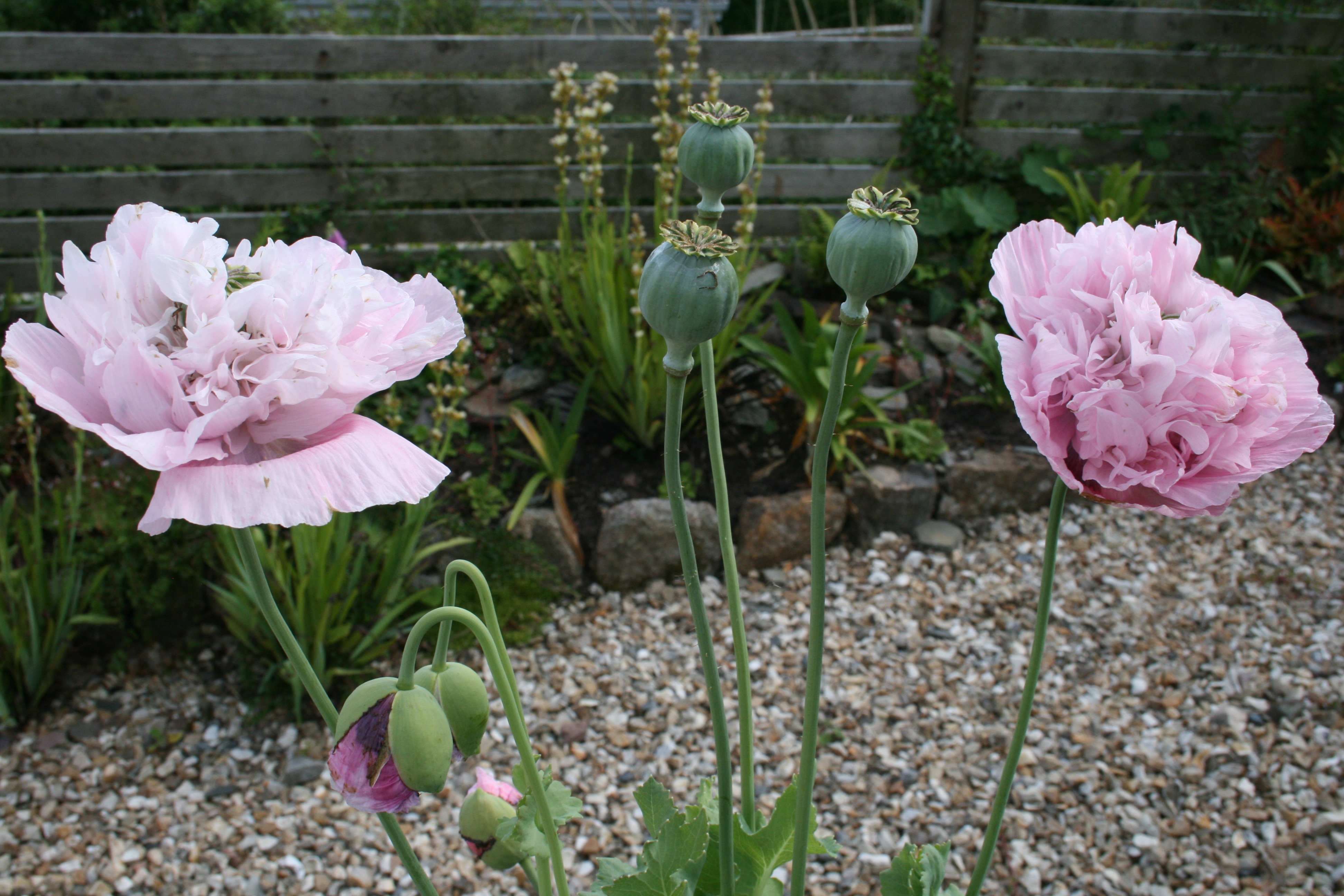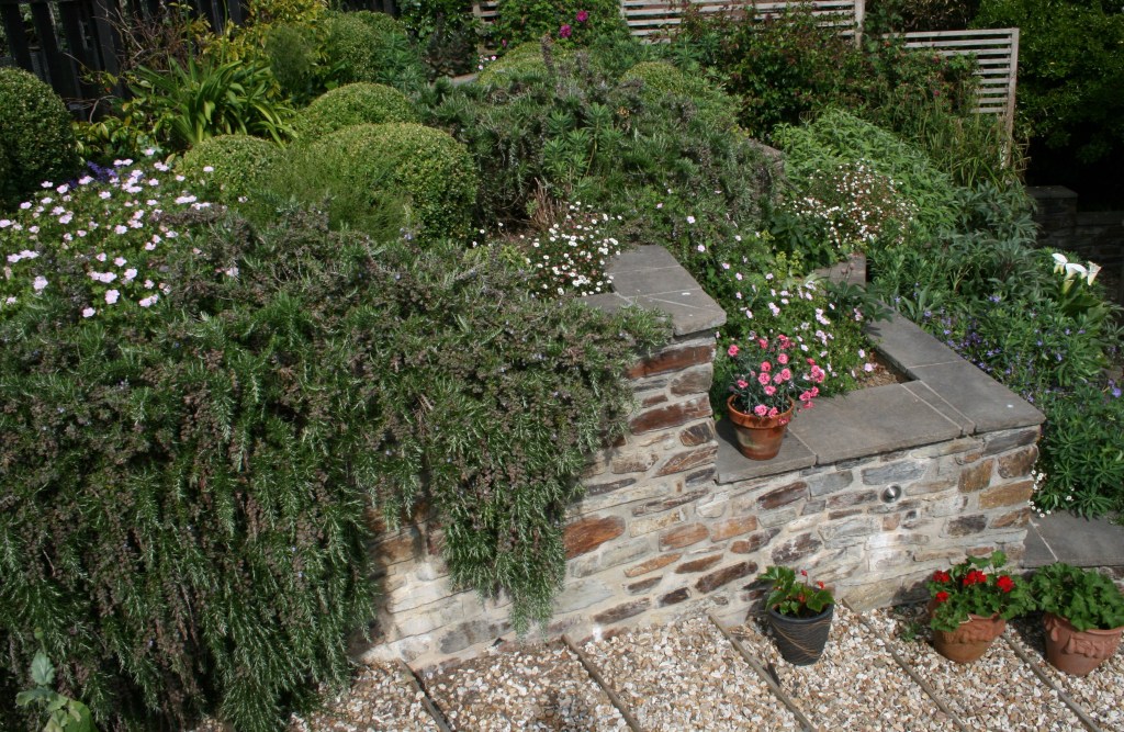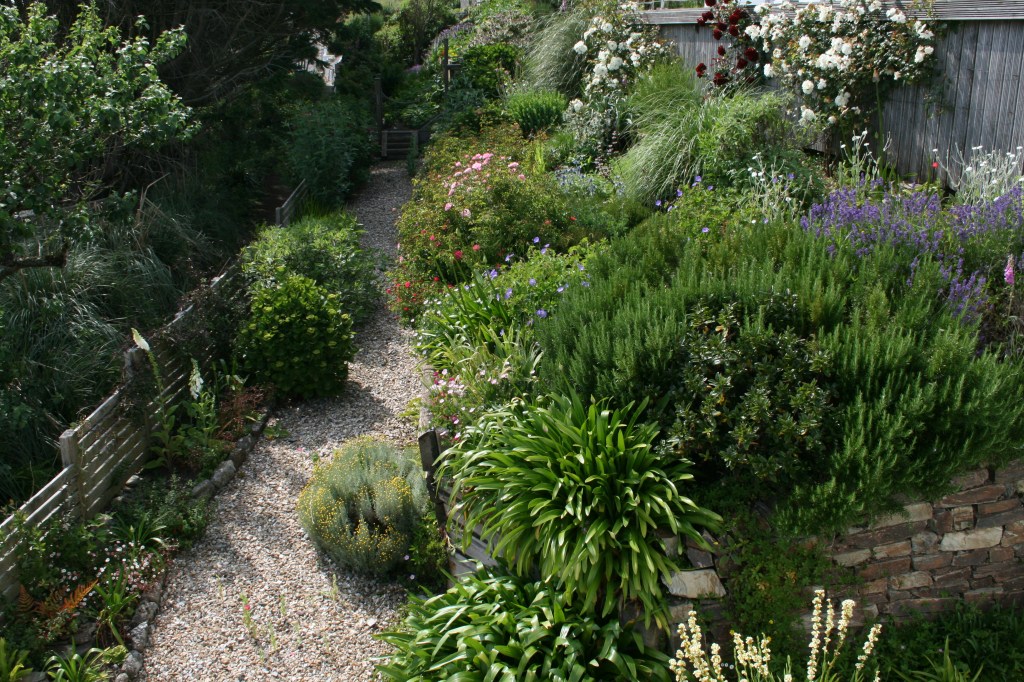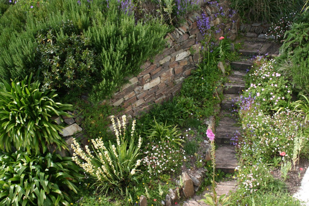 Tumbling and climbing roses along the stone river; cascades of rosemary with pops of erigerons and an arum lilly by the steps; and sisyrinchiums, geraniums, poppies, foxgloves and more erigerons lining the old wooden steps: