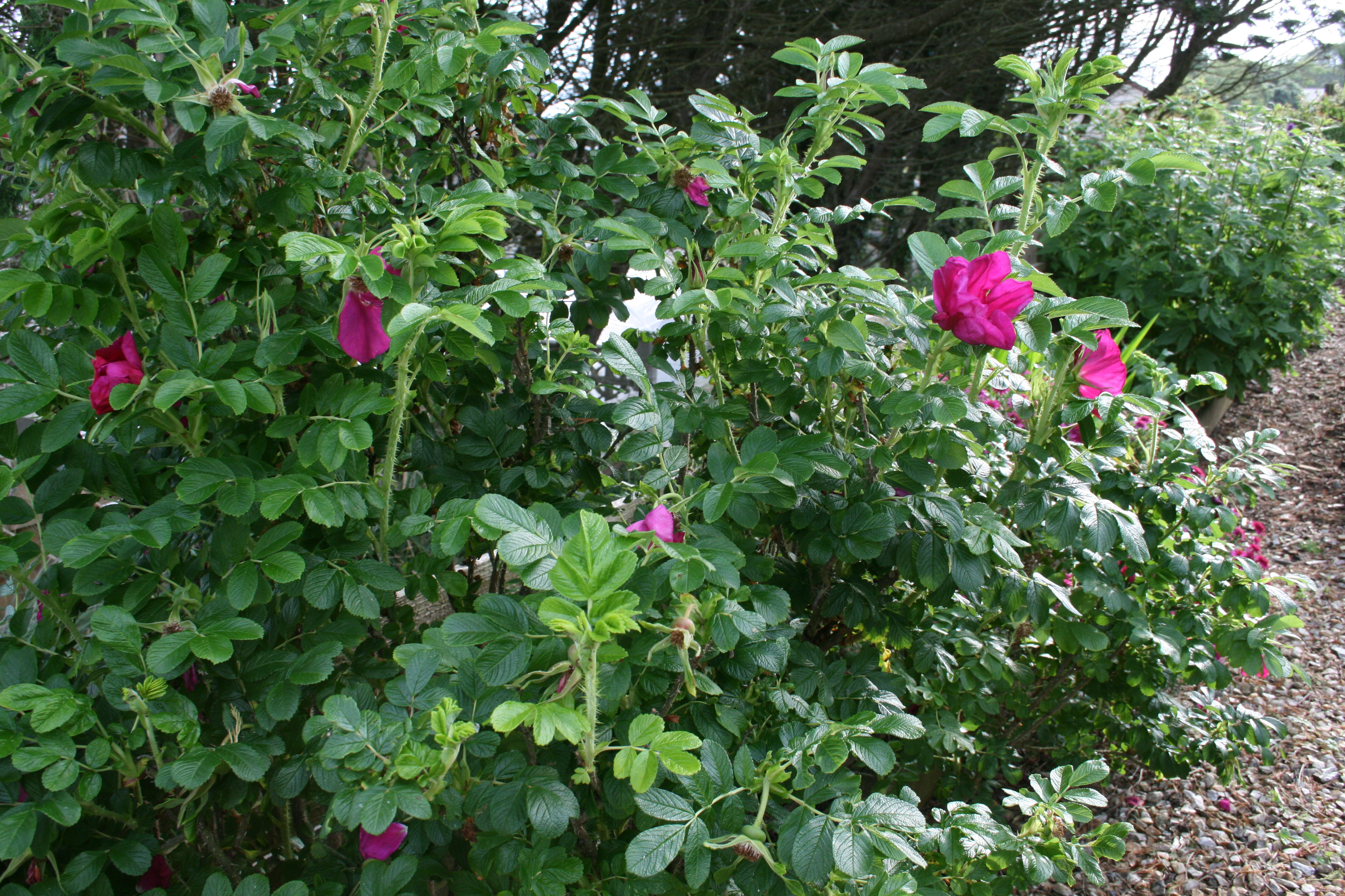 Down in the secret garden, despite the storms, the rosa has been as fragrant and as crimson as ever and the dog rose is scrambling well; the agapanthuses are getting ready to burst open: