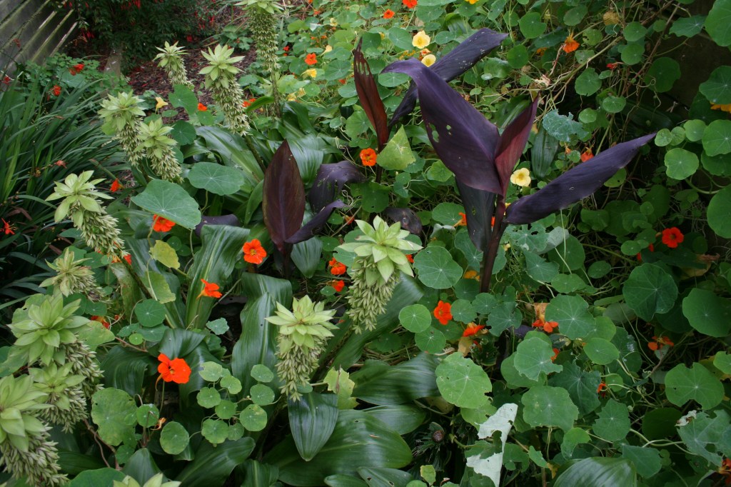 Over in the west end garden, the cannas have been swamped by the nasturtiums but they are trying as are the eucomises. Next year, covid-free hopefully, we will get the nasturtiums under a bit more control.