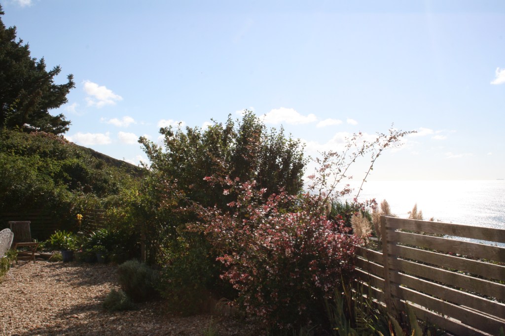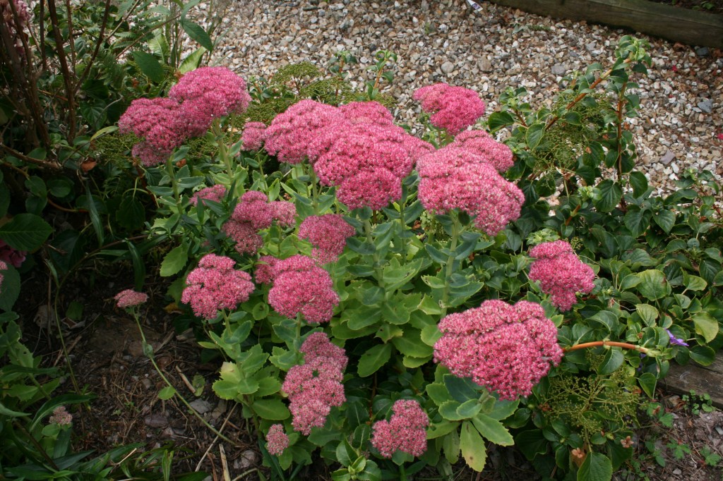 For this month’s hit of pink, there are the sedums which come into their own at this time of year. The ice-pink one is my favourite. And there is a mysterious pale pink shrub down in the secret garden overlooking the sea.