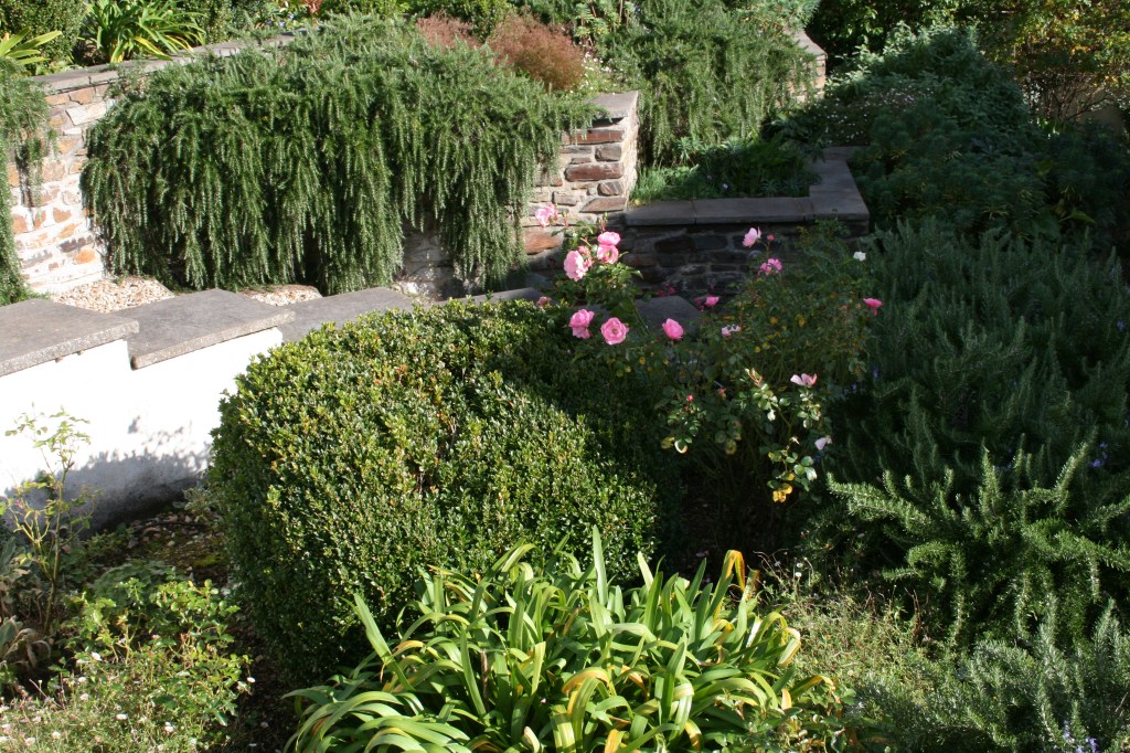 But there is the odd day when we get some weak sunshine which, although low, manages to create pockets of light. A newly planted arum and the old stalwart rosemary fountain and carpet rose can still sunbathe for a while longer. And the delightful campanulas and primroses on the corner of the west garden have already burst into life, about twelve weeks early.