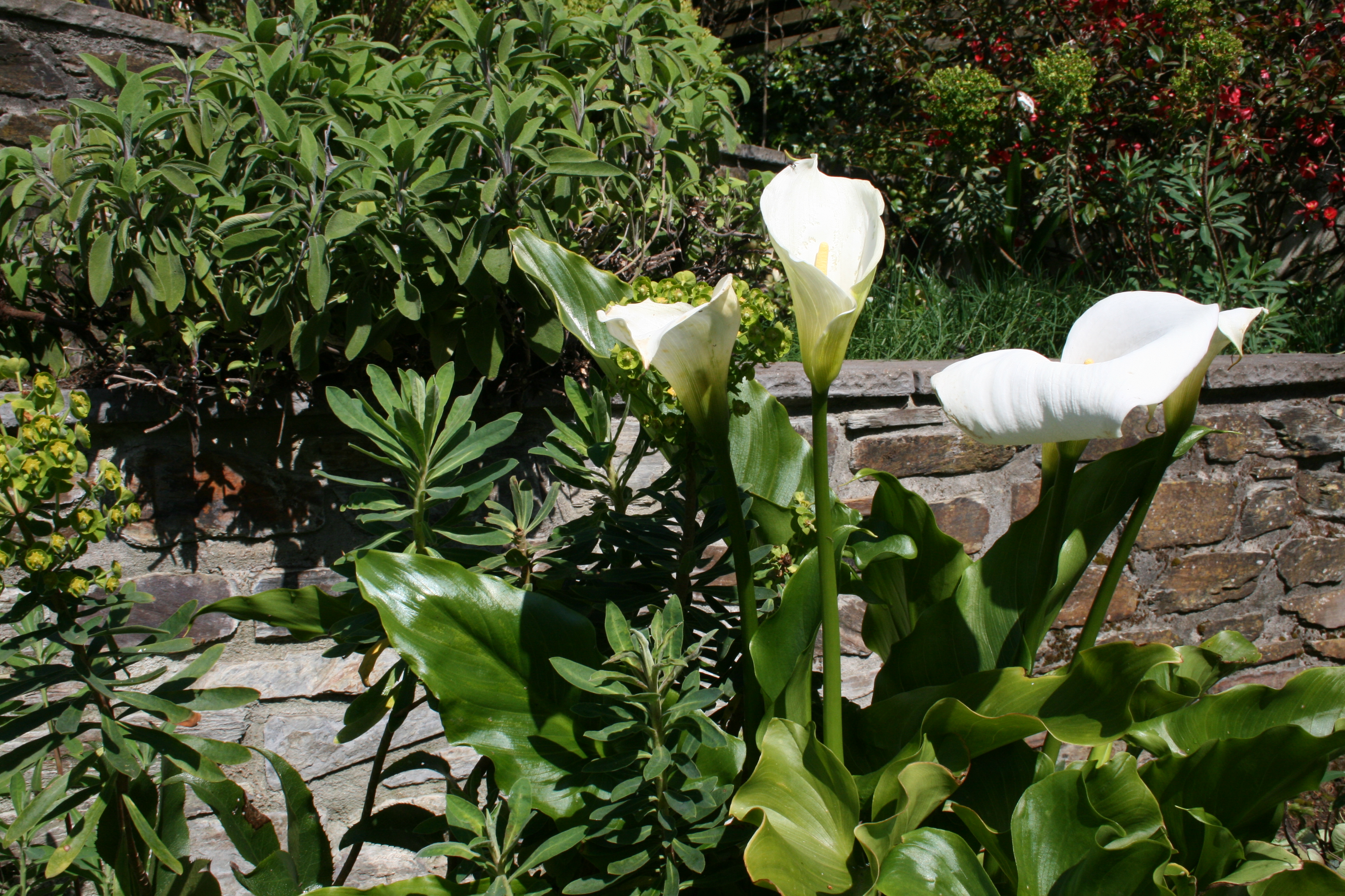 We are now getting more of these bright sunny days to relieve us from the cold blasting winds from the east or the rolling fogs that creep in over the waters from the Bay of Biscay and the Atlantic ocean. The constant winter rains have soaked into the earth and, together with the spring’s warmth, have created the magical conditions for growth. The flourishing terraces are already full to bursting and the arum lillies are a real showstopper.