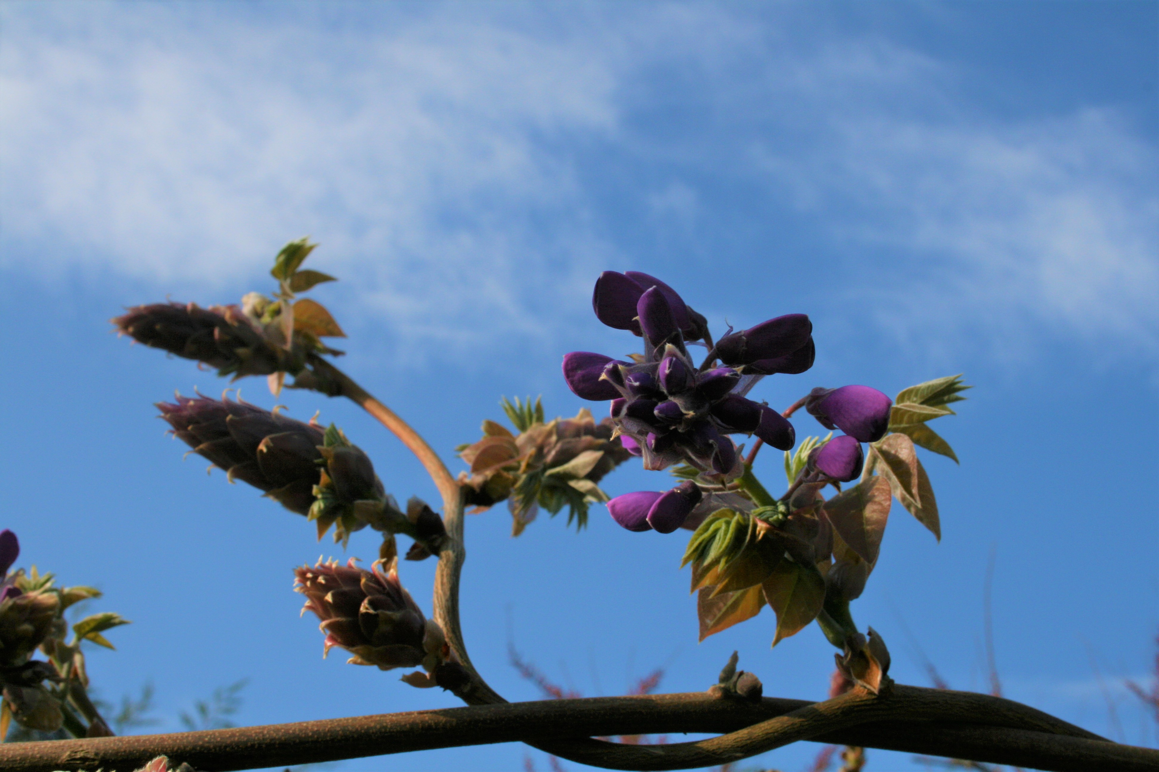 With the sun’s warmth, the buds are breaking out all over. The clematises and wisterias are promising many pink and purple flowers as they bask in the bright light.