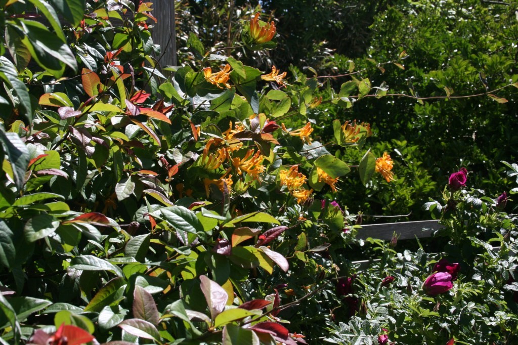 If only you could smell the fragrances now filling the garden, especially in the early evening after a sunny afternoon. The Rosa Ragusa is magnificently fragrant. The wisteria is just going over but its fragrance still fills the air in the western garden and the red climbing rose by my study has just arrived on the scene for the summer. And a delicate honeysuckle has popped up in the middle of the quince – not sure where it came from but its lovely in the terraced garden.