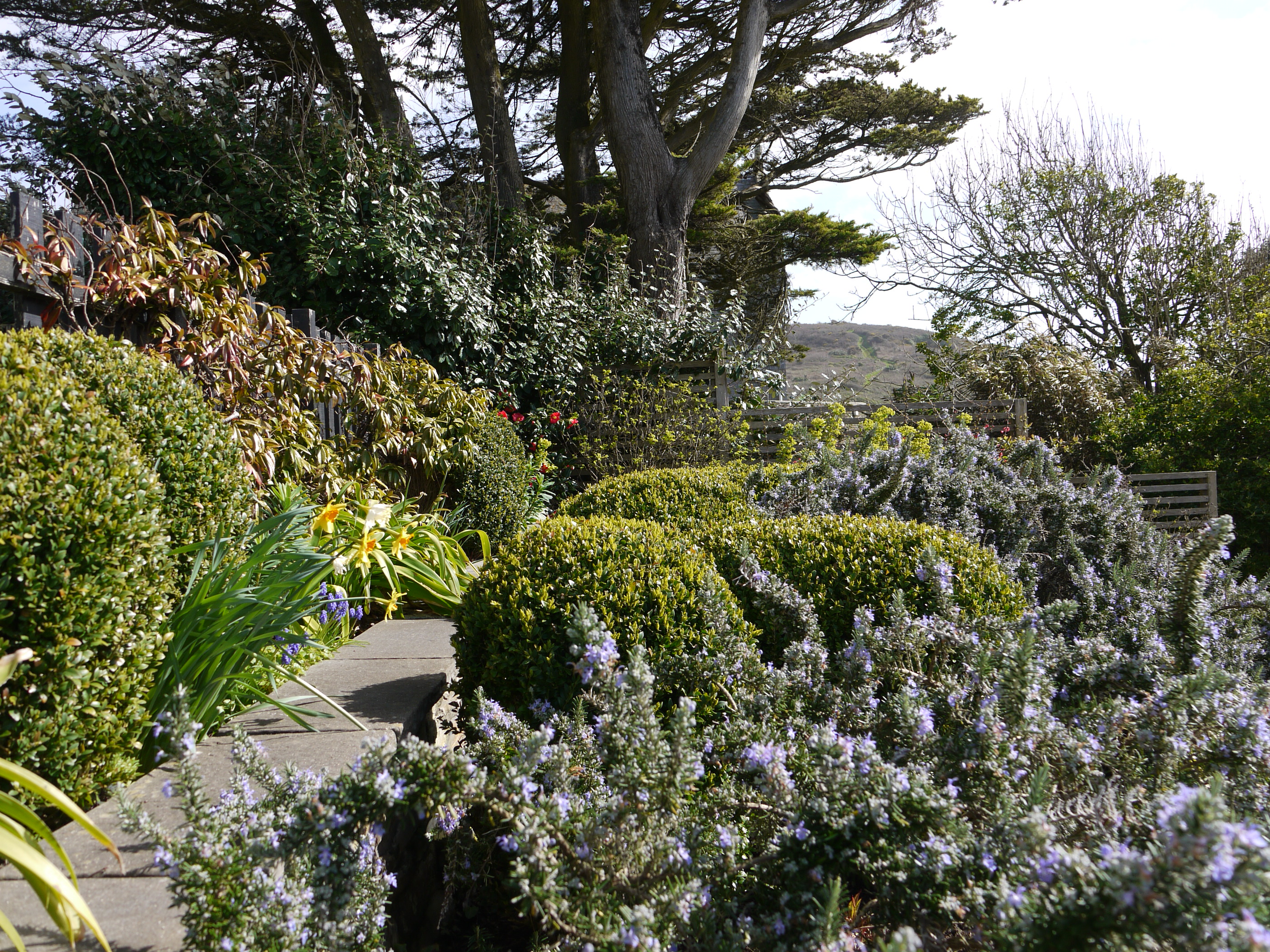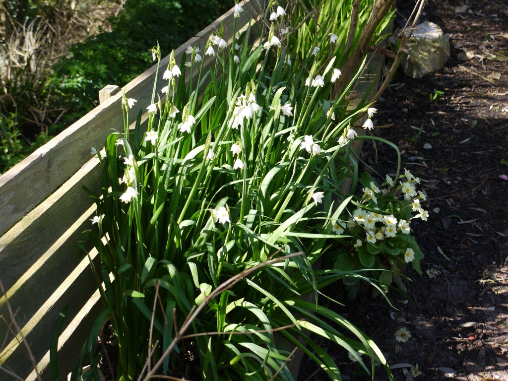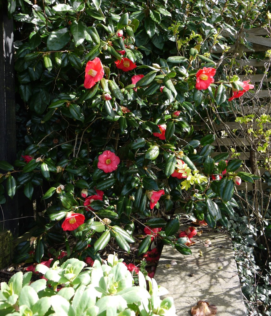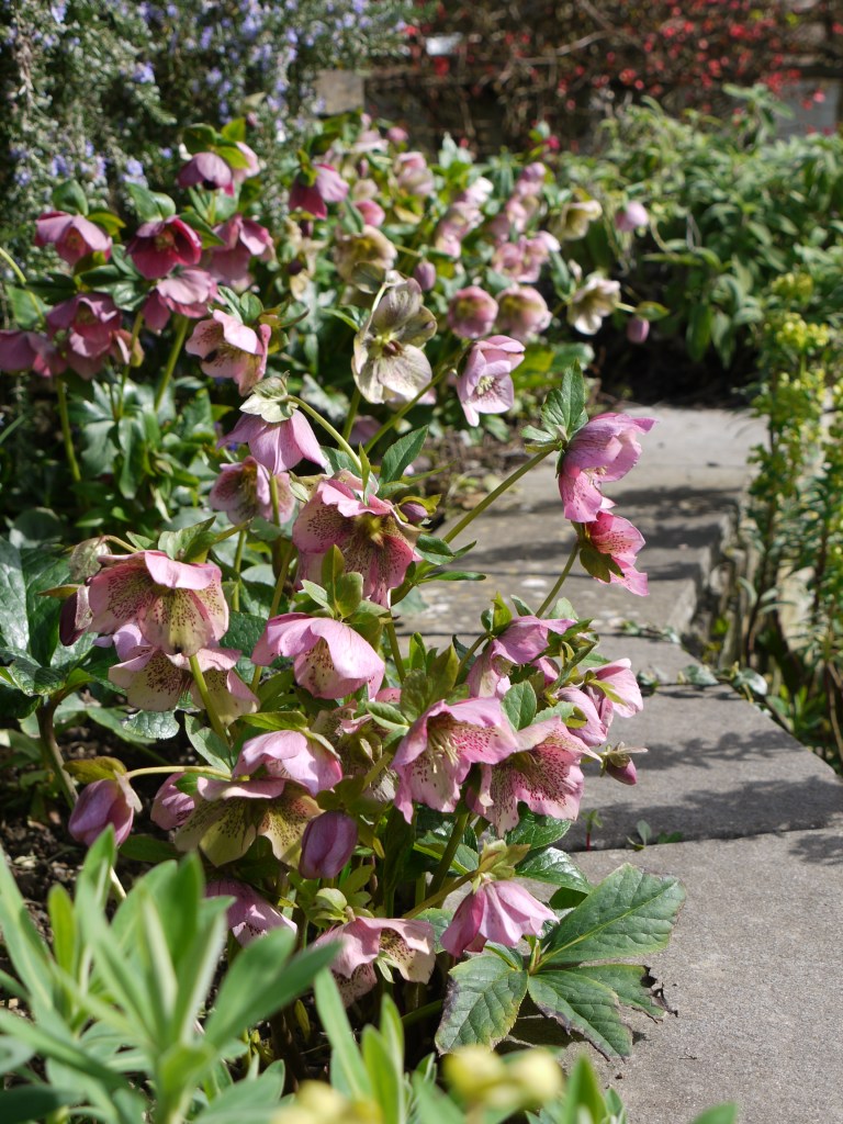 The row of pink hellebores and giant snowdrops with a pop of yellow primrose, and the delicate camellias, tell you Spring has arrived with a blast.