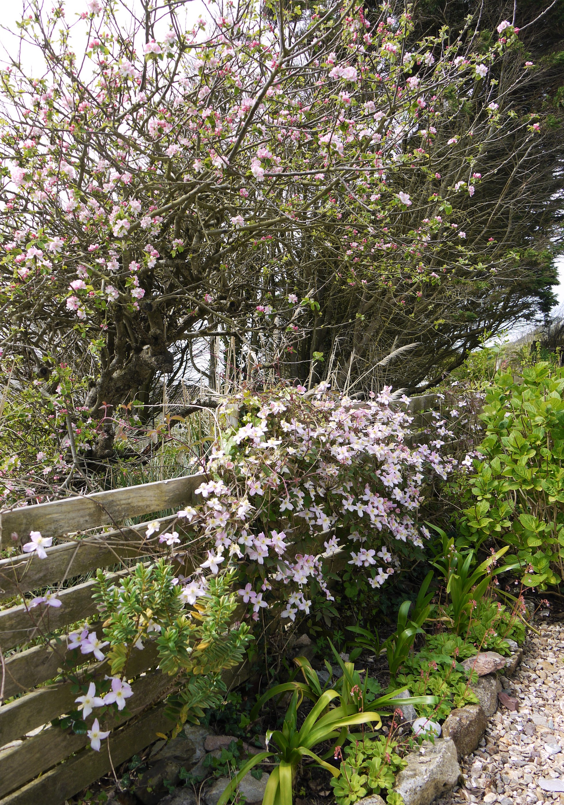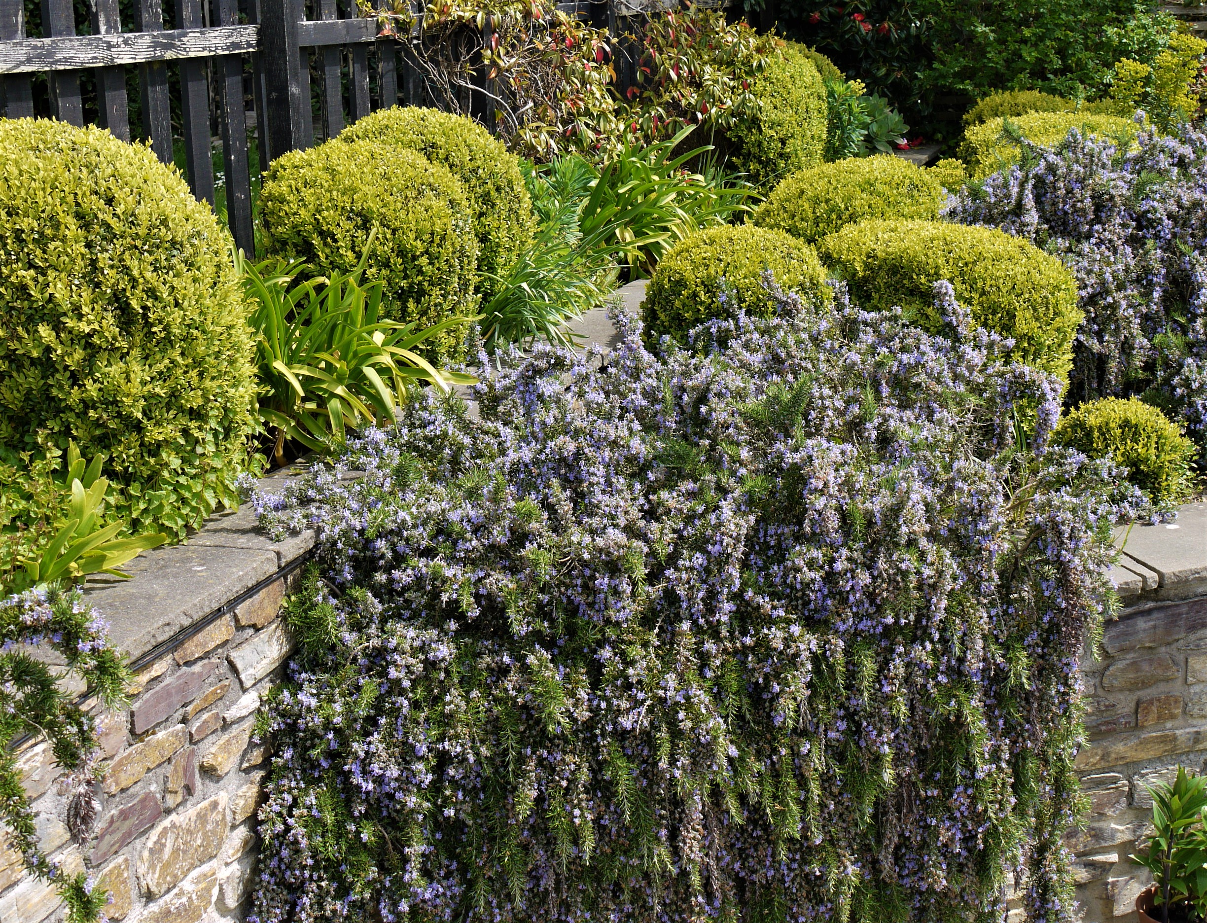 The old apple tree down on the stone river has lost a few branches but what remains has sprung into life to complement the lane’s clematis. And the old stalwart buxus balls and cascading rosemary waterfalls are bowling along as ever.