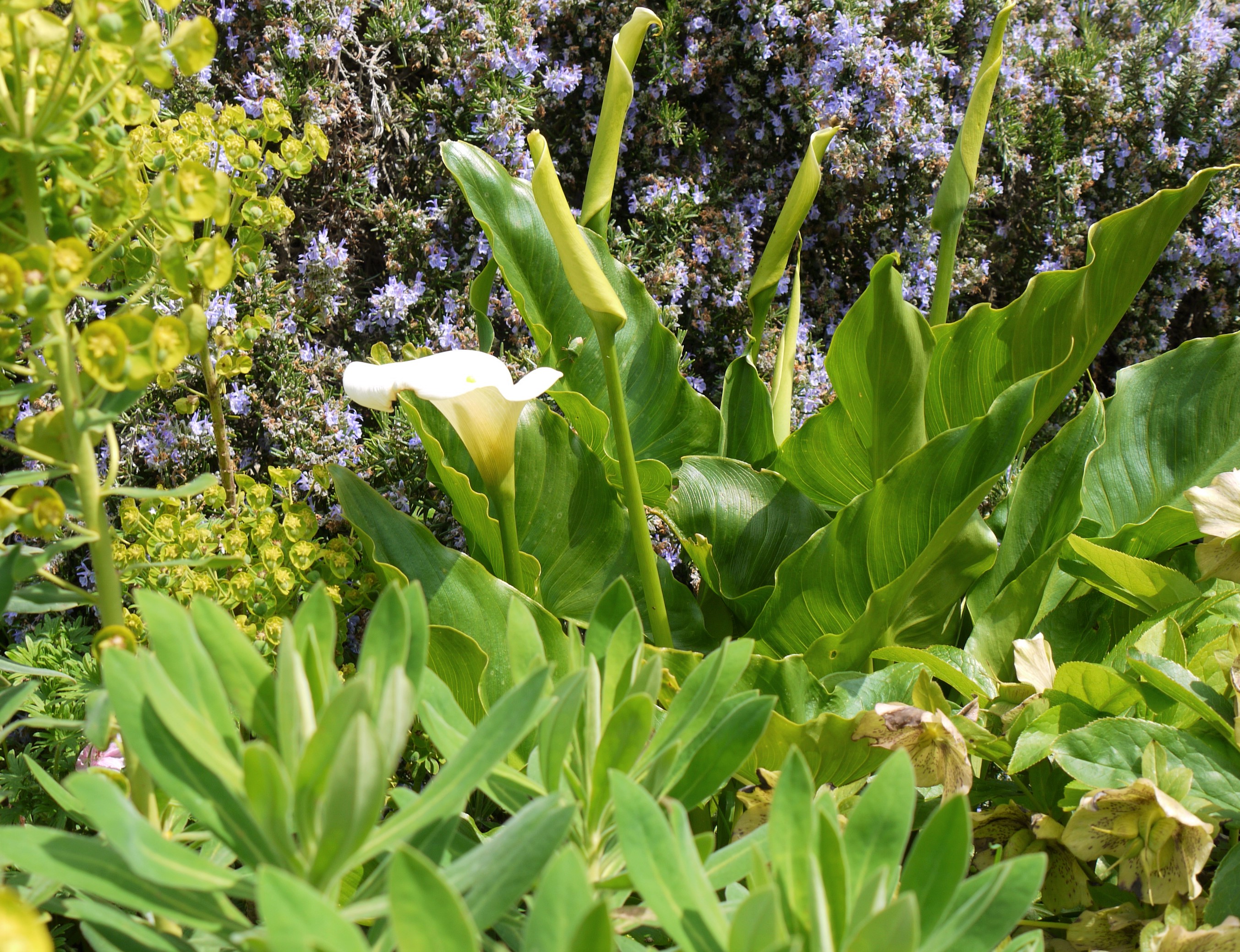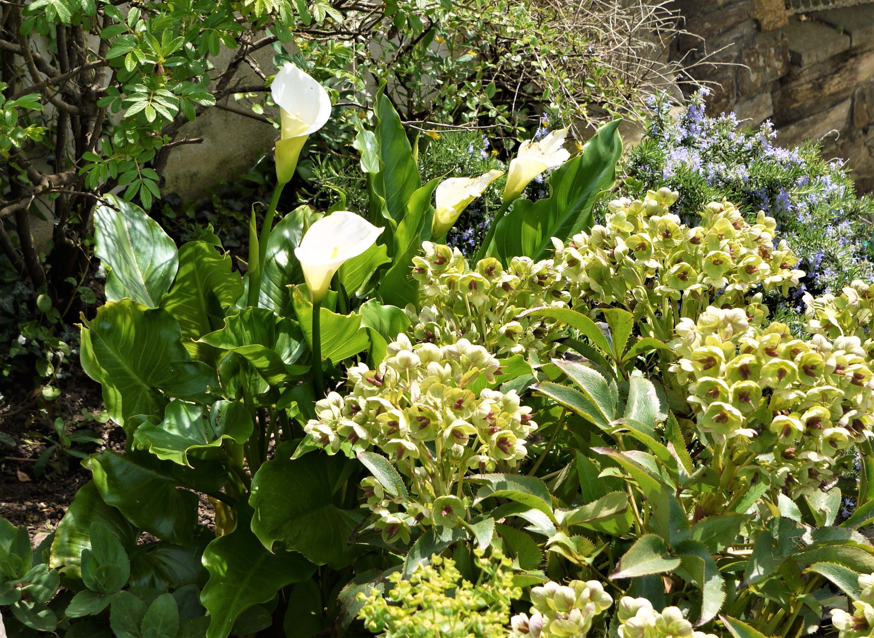The warmth and returning light of Spring are so welcome after such a harsh winter. All that pounding rain has resulted in a tapestry of vivid greens which form the backdrop to an abundance of buds and new life. First up, there is an old favourite that has popped up in the terraces – the arum, or peace, lilies. They are so elegant and statuesque having risen miraculously from the mush they were over the winter.