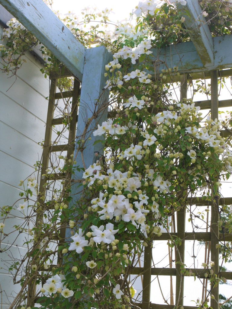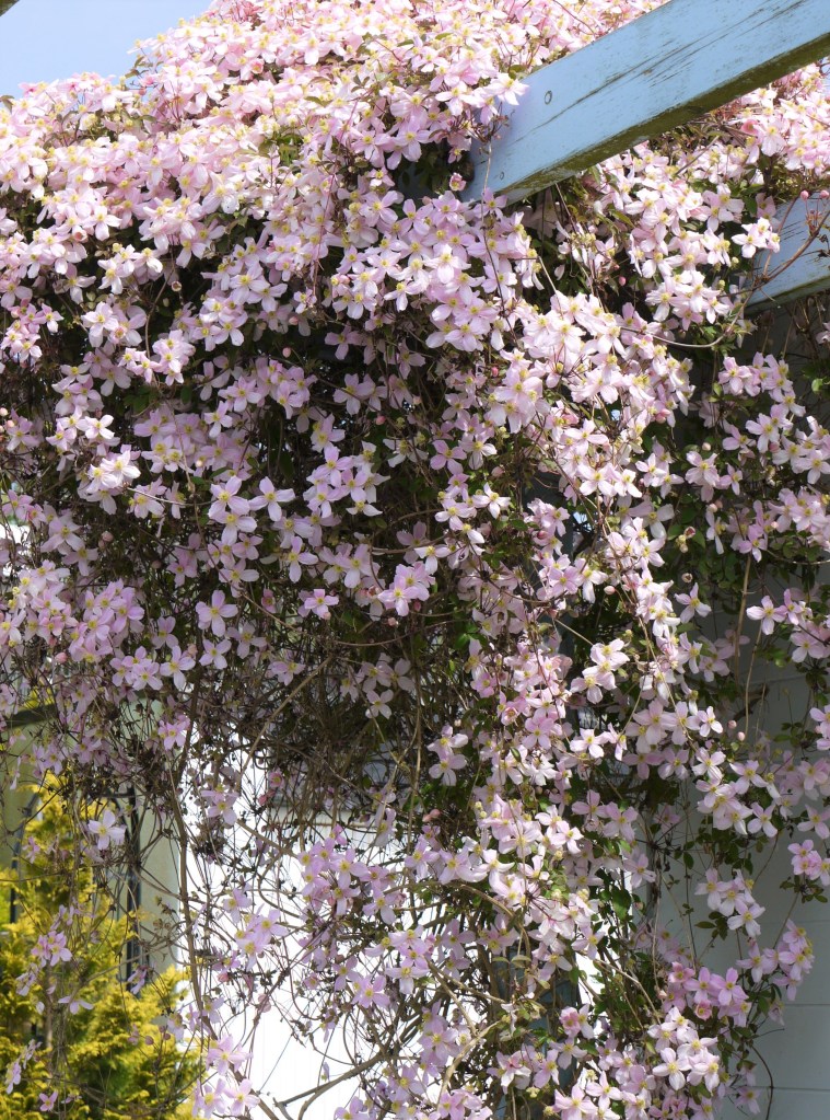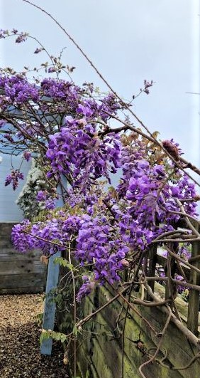 A muddle of clematises over in the exposed west garden have burst into life from bare stems that only a few weeks ago looked dead. And the nearby wisteria is getting going to join the mess.