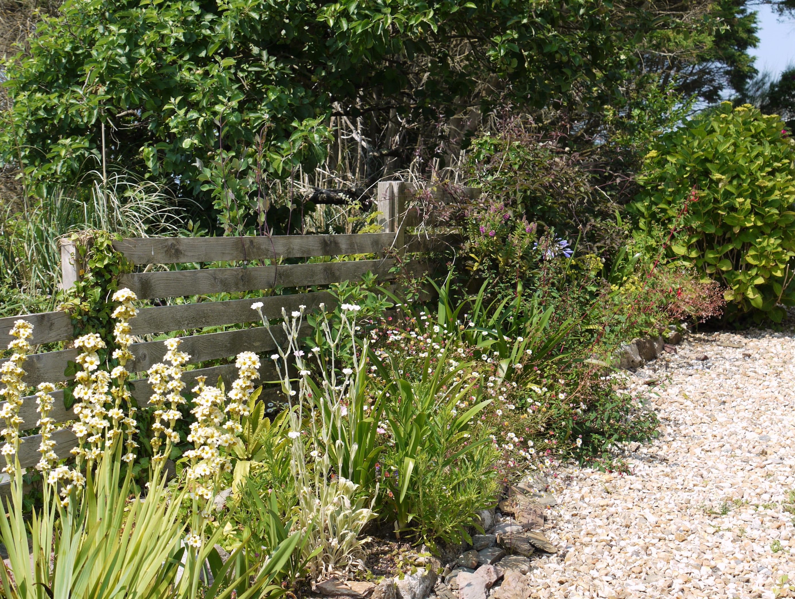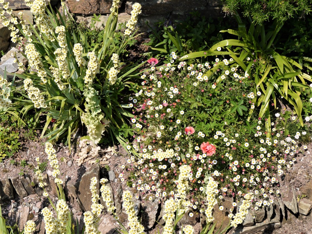 Self-seeded erigerons (aster family) and sisyrinchiums (iris family) fill every space along the lower garden’s stone river and a few delicate poppies have popped up too.
