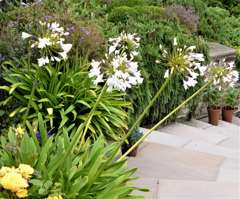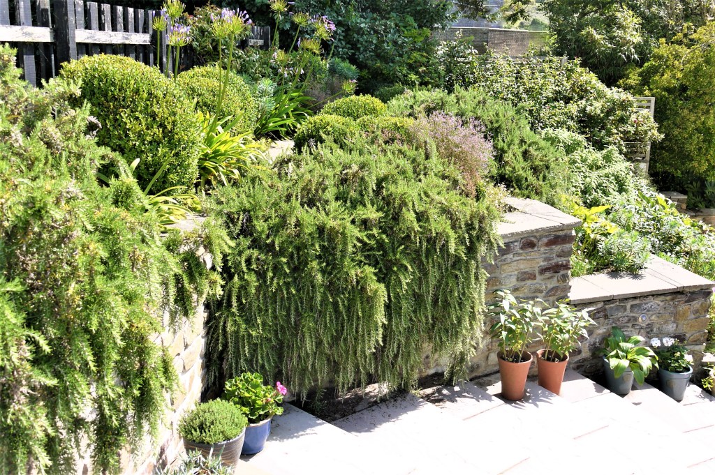 The summer’s rain has been very good for the plants which are overflowing their banks – just look at the terraces going down to the house, especially the blue-tipped white agapanthuses poking out of the rosemary waterfalls and the healthy buxuses.
