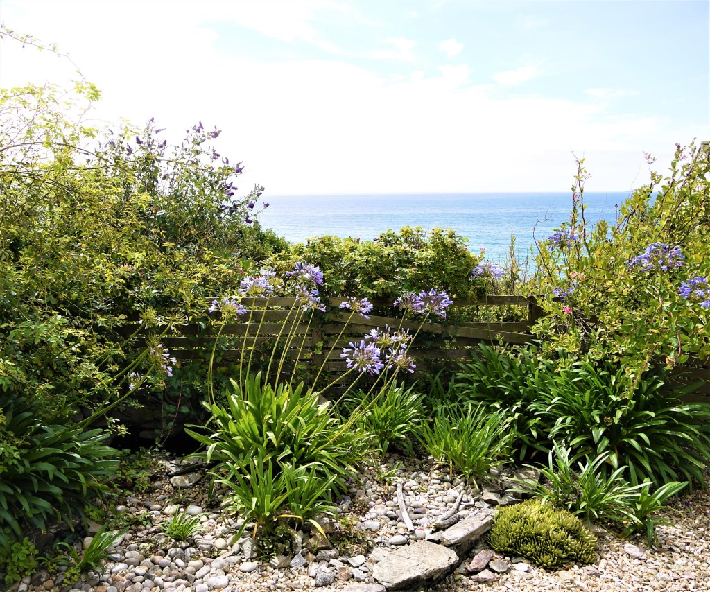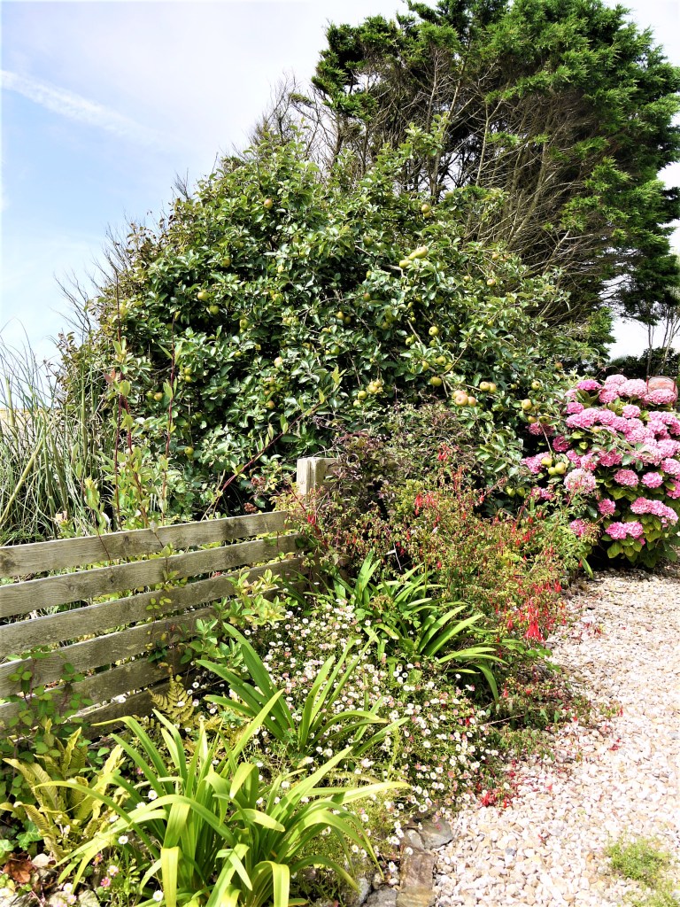 Down in the secret garden and along the stone river facing the sea, the last of the blue agapanthuses and the abelia are still on show. And the self-seeded apple tree is full of fruit.