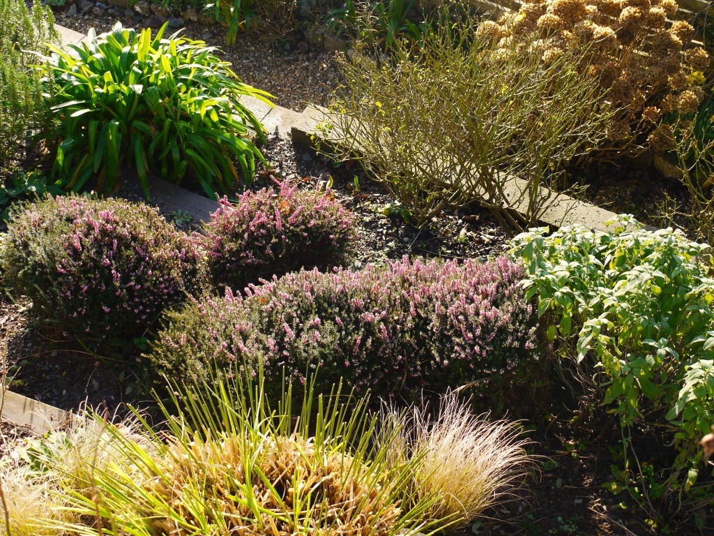 Despite the wintery temperatures, there are the first signs of spring: daffodils with a pop of pink from a sole primrose. The heathers have survived and are trying while the agapanthuses down in the secret garden look very healthy despite the constant salt blasting and the frost.