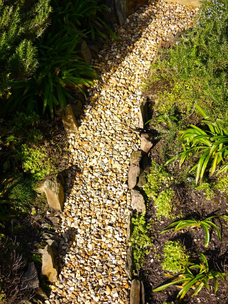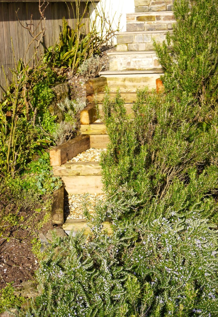 The storm damage repairs are ongoing, but take a look at these new steps and pathway to the upper terraces. That golden stone exudes warmth in the watery sunshine.