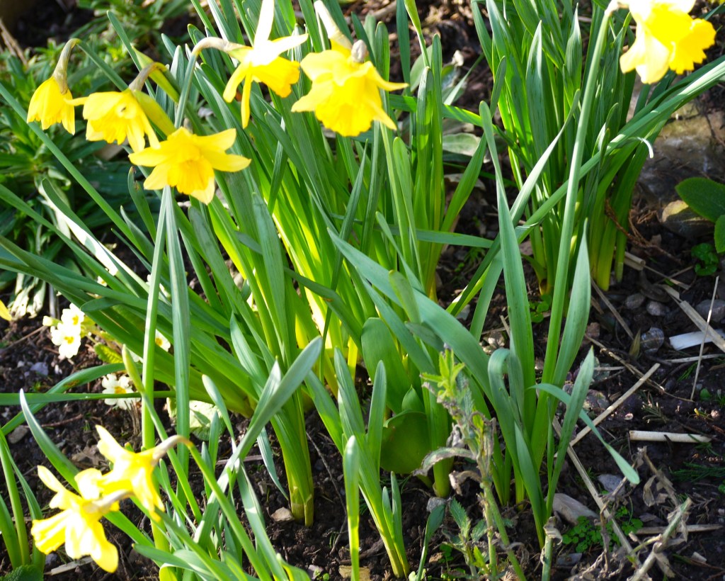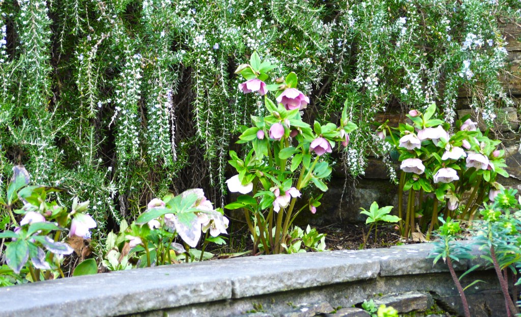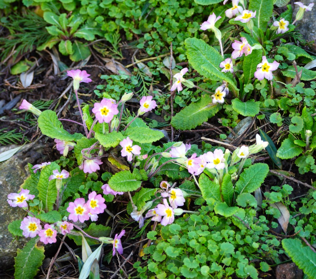Despite the weather, the spring garden is firing up: hellebores, daffodils and primroses: