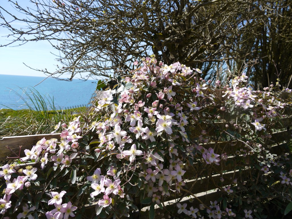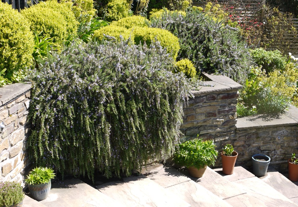 Sweeps of clematis montana are out and about showing the still bare apple tree how to blossom while the ubiquitous rosemary waterfalls are still tumbling over the front terraces.