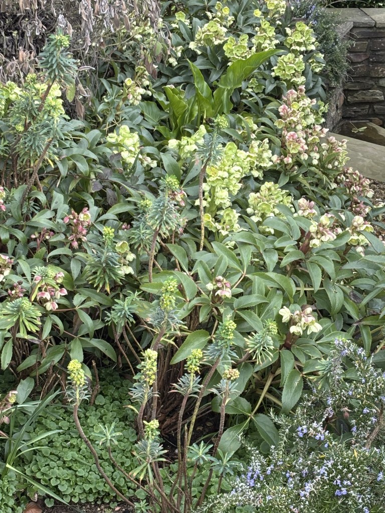 Elsewhere, the tough leathery hellebores are muscling their way through and showing the pretenders whose boss while a red camelia has popped out of the shrubbery in the upper tier looking for some light.