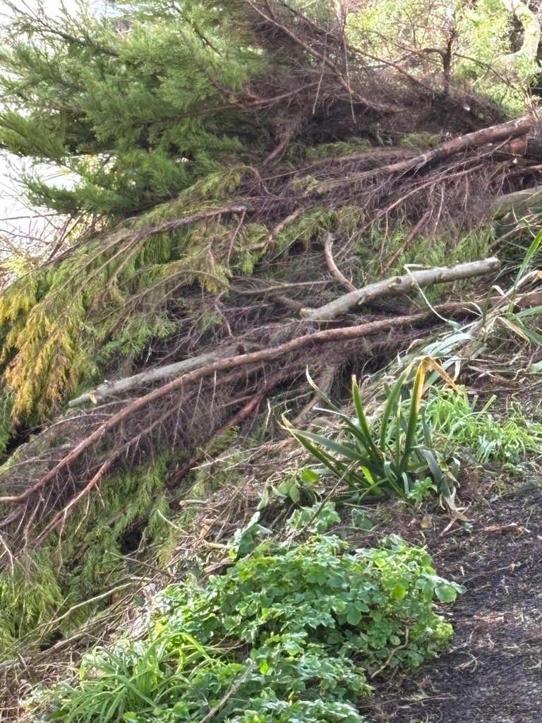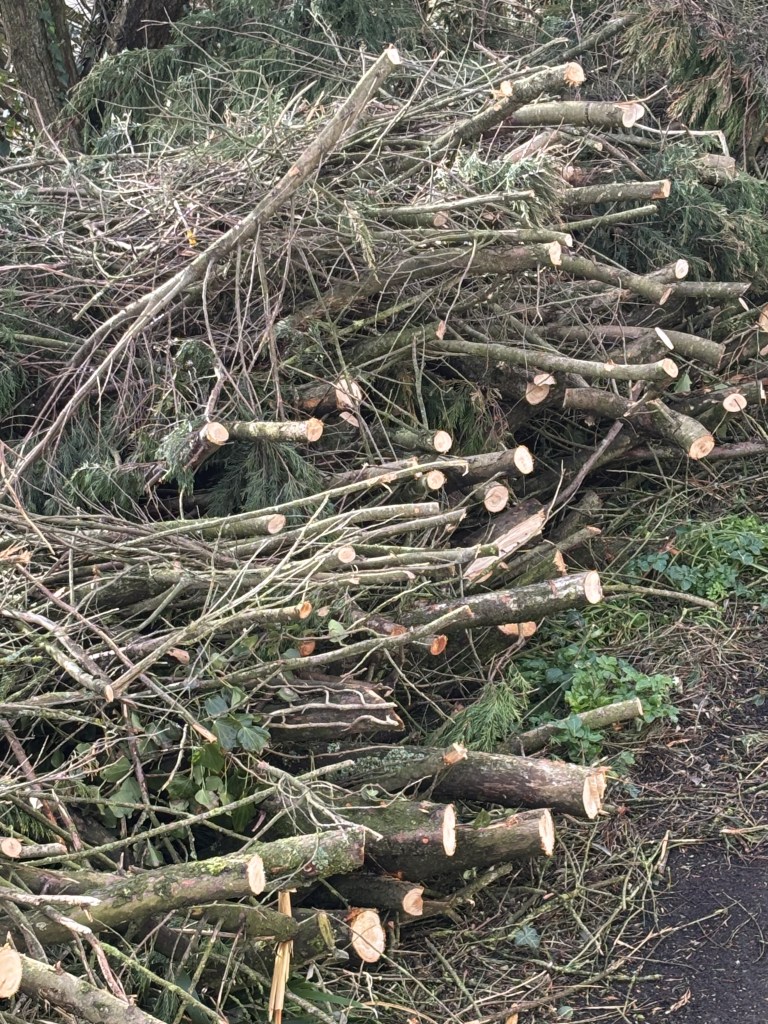 These great guys go out in all weathers to make things safe for us. And we now have logs galore, enough firewood for a lifetime. Just got to store them somehow. The frothy tops are going in the shredder when it has been mended. Recent overuse has taken its toll.