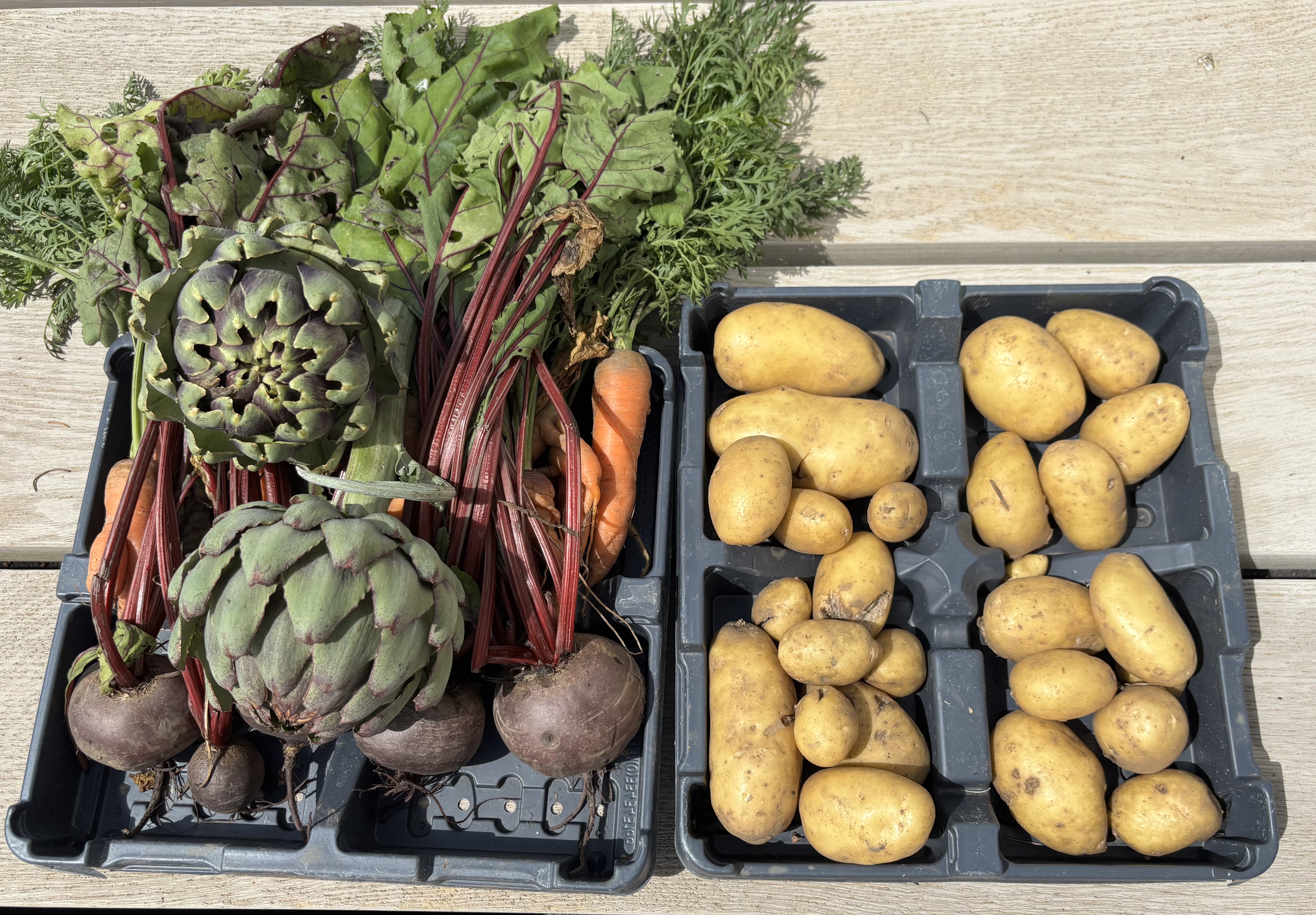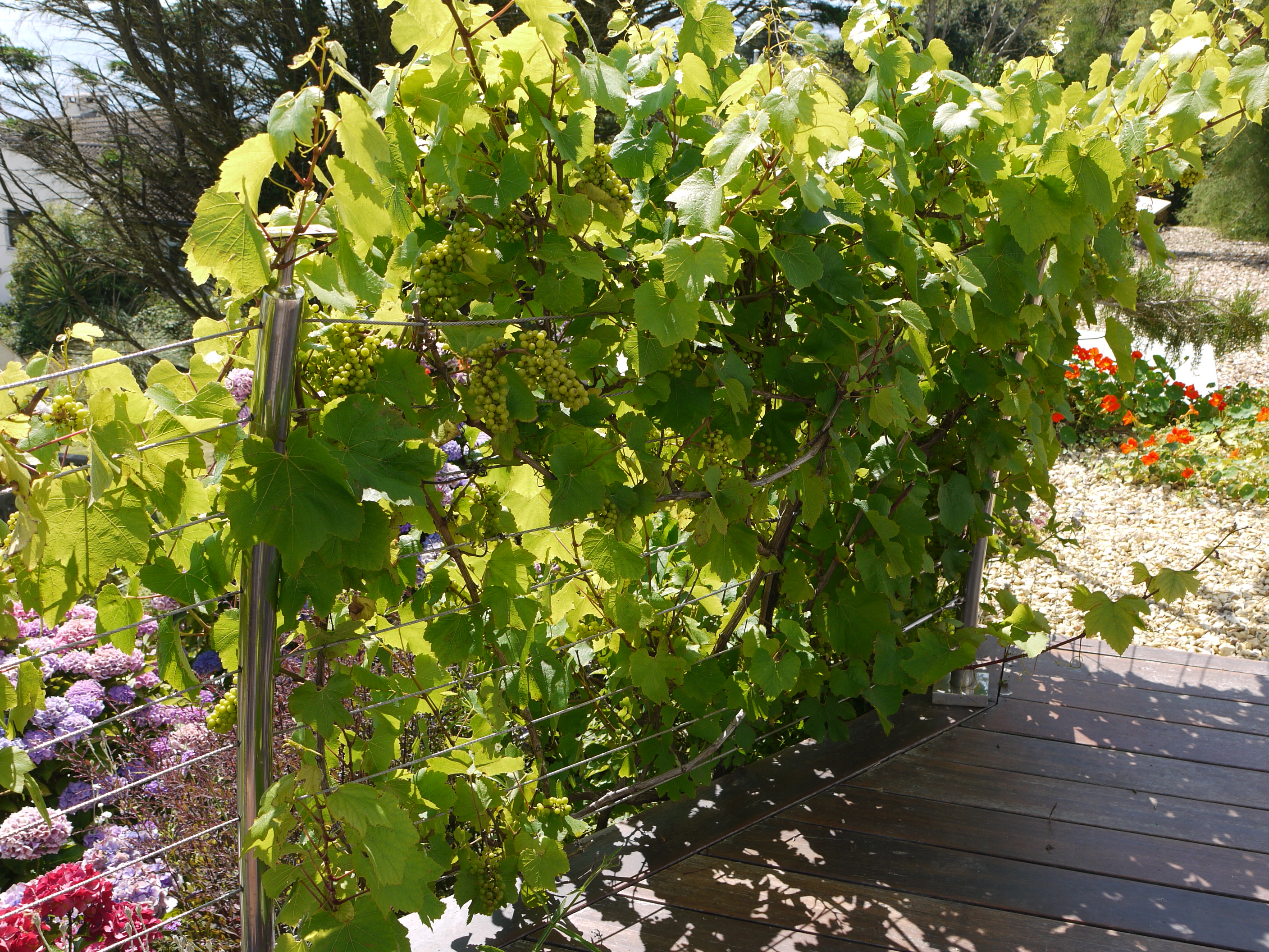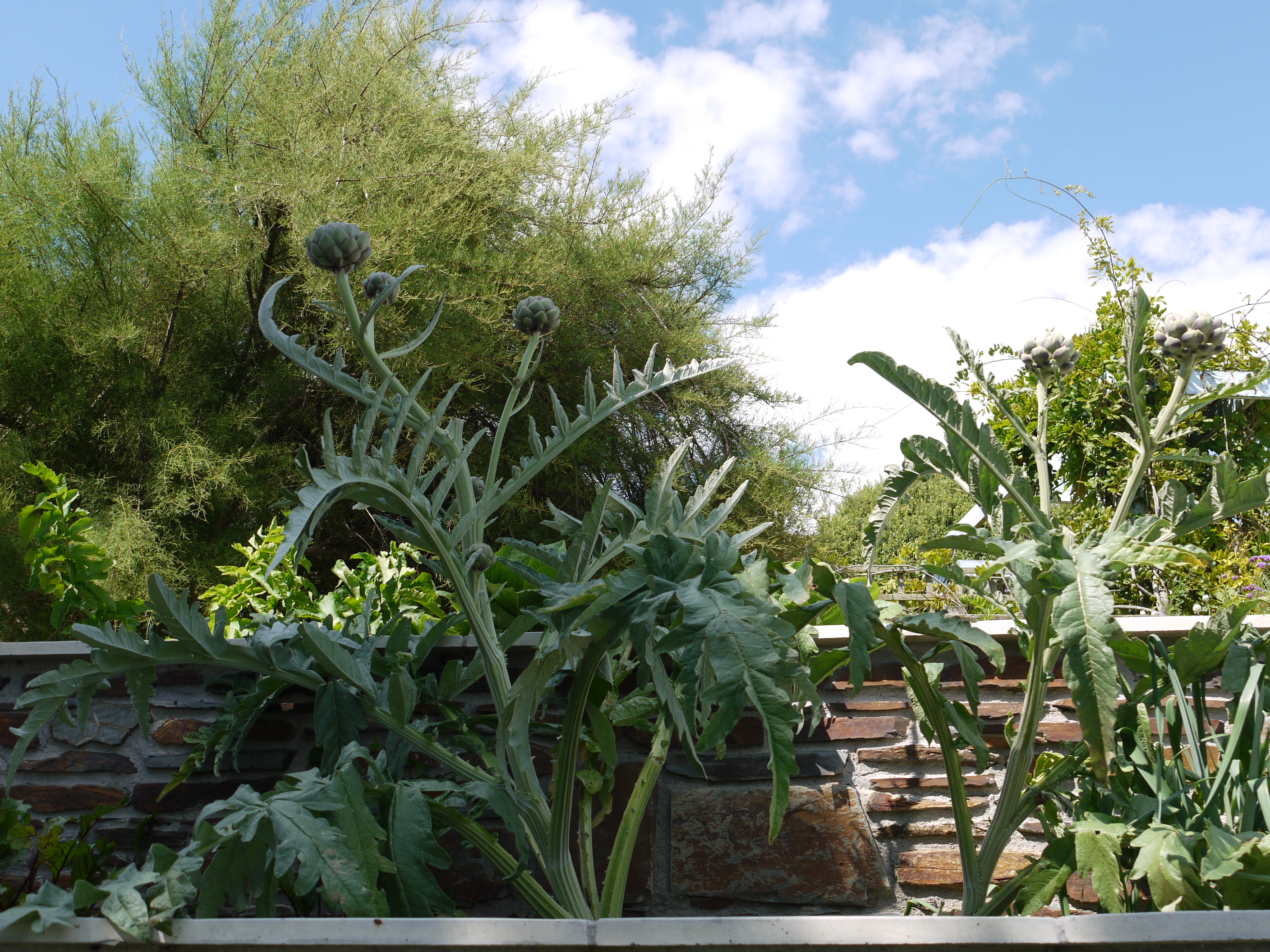 In the veggie garden, the harvest has come a bit early as the intense heat has stimulated the growth hormones to go early. The result is a summer bounty of fresh veggies. The grapevines have recovered, and we’ve got some grapes, albeit they are on the small side; the garlic is out and drying in the sun; and the statuesque artichokes are ready for the cut and the pot.