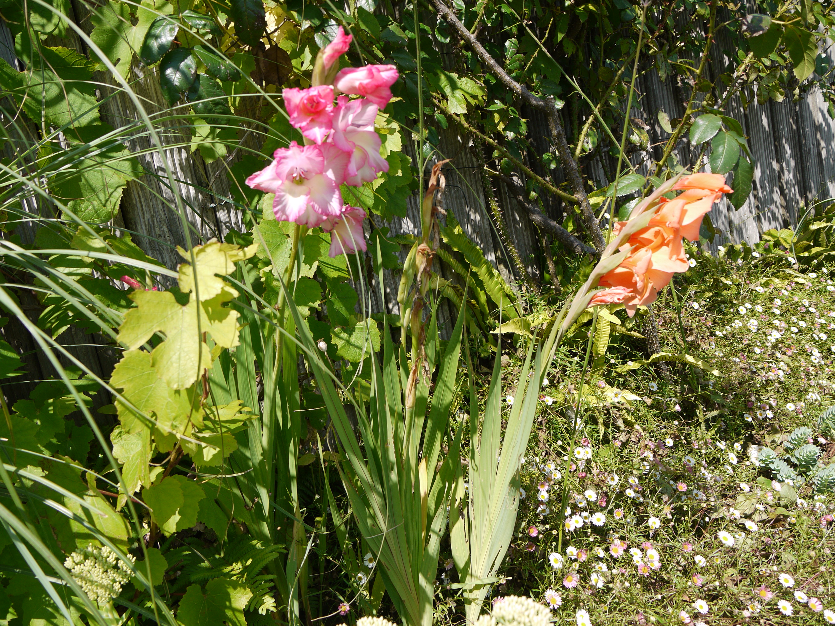 And the remedial work is going ok despite the drought. The olive tree is sprouting from its pollarded stump; and the fuchsia is recovering well from being cut to the ground following an infection. As for the Rosa, it gets its cutback after the hips have had their time in the sun, and we have a pop of vibrant candy colours in the flowering gladdys.