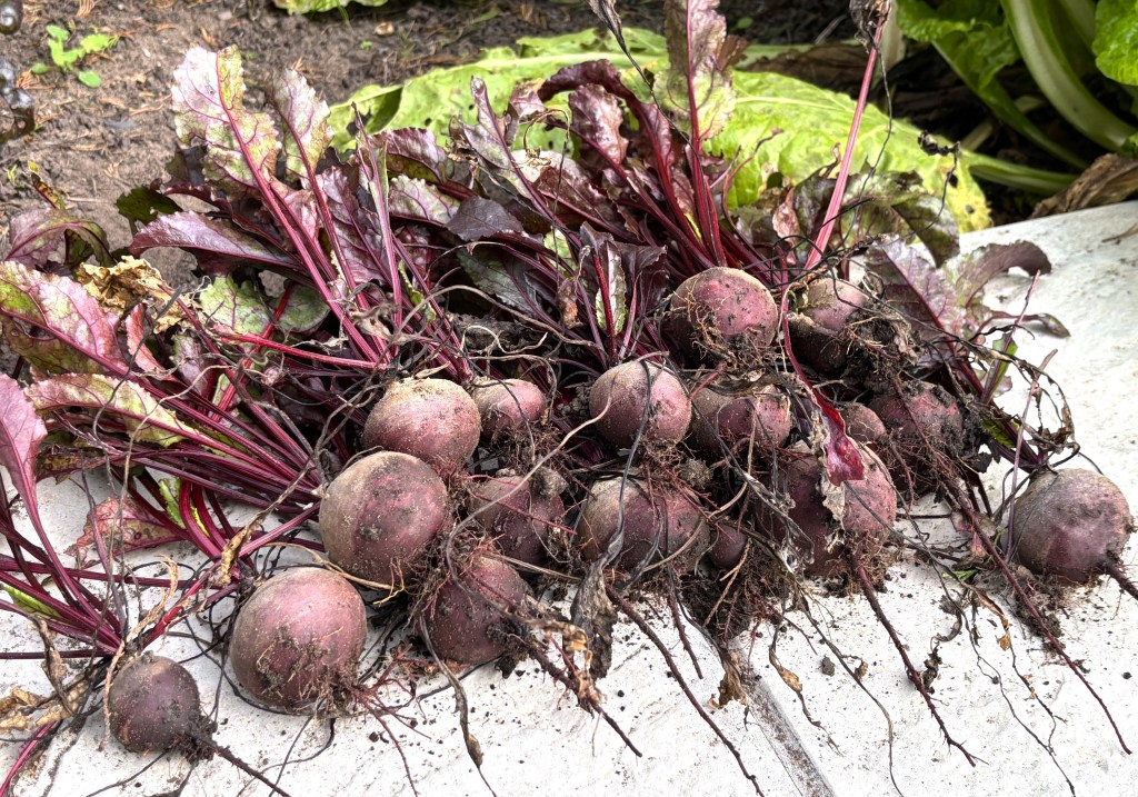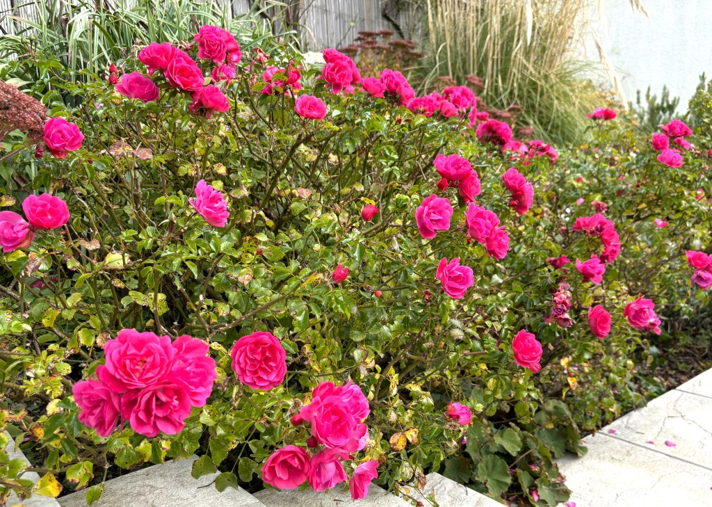 The last of the beets and radishes have been harvested and eaten, and the veggie terraces have now been left to their winter’s rest. But the carpet rose has burst into another prolific late showstopper of barbie pink flowers. It stands in great contrast to the muted autumnal colours of the fading hydrangeas.