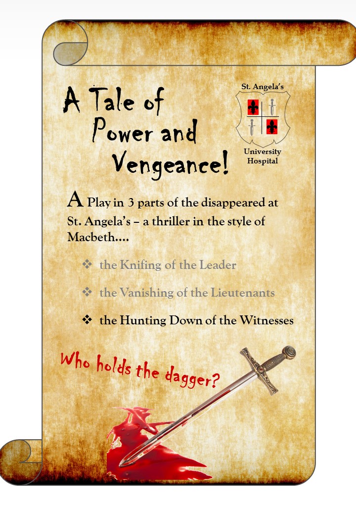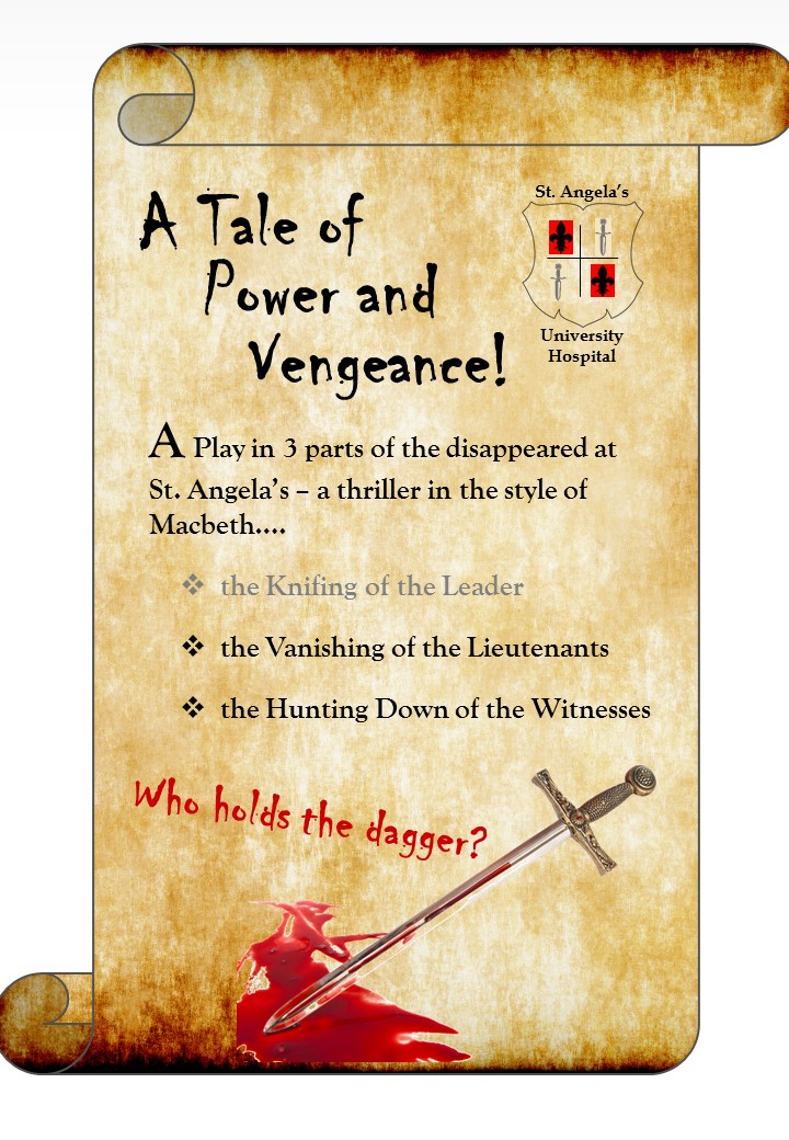 Robert MacCawdor, now the confident Director of Planning, having rid himself of those pesky lieutenants: the “rower”, the “techie”, and “teflon man”, and having surrounded himself with his ever-faithful adjutant, Lady M, and his “eyes and ears,” the three watchers, felt quite at home in his large comfortable chair looking out of the executive floor office’s picture window at the rowers practising on the river in the soft early morning light.